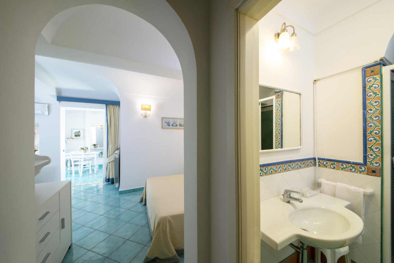 La camera Vista Mare, luminosa e accogliente, regala un’atmosfera elegante e rilassante. Il balcone privato si apre su una splendida vista mare al tramonto, ideale per vivere momenti di quiete e ammirare panorami indimenticabili.
